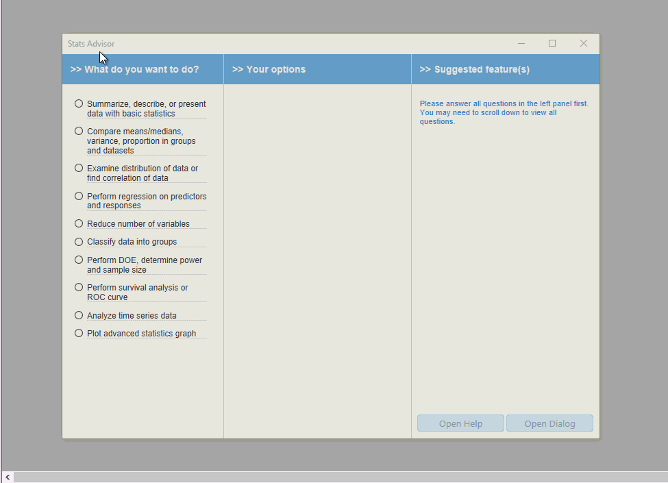 Open the Stats Advisor App, you could see three column, including What do you want to do, Your options and Suggested feature(s).